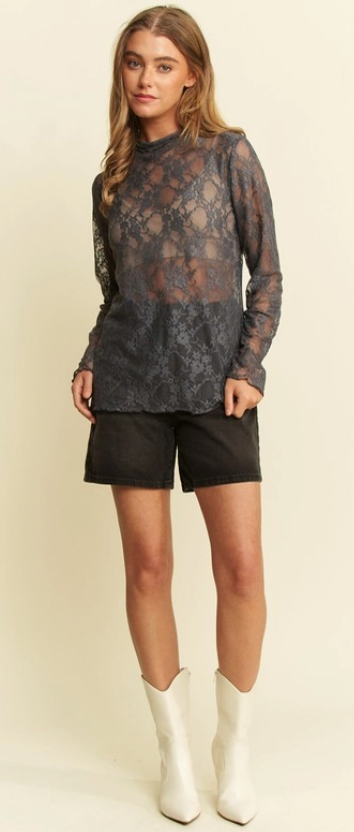 -Mesh -Good stretch - Mock neck -Floral print lace long sleeves top FABRIC:90% NYLON 10% SPANDEX